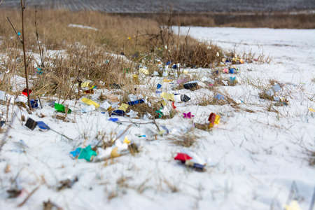 Confetti lie in the snow after the holiday. Natural meadow covered with garbage. Ecological problems.