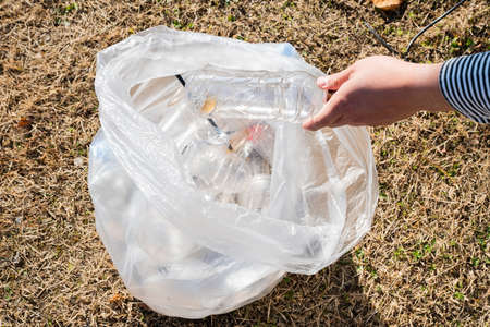 Volunteer picking up dirty plastic bottles in park. Woman hand in glove picking up trash, collecting garbage in bag. Cleaning up nature from single use plastic