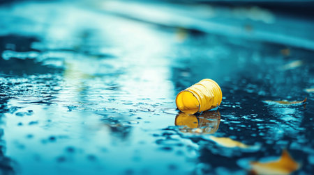 A close-up shot of a yellow leaf lying on a wet surface, reflecting the sky. The image captures the beauty of nature and the effects of rain.