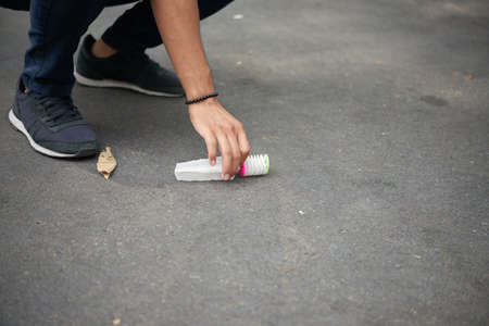 Close up of woman hand collecting garbage on the floor in the street with copy space