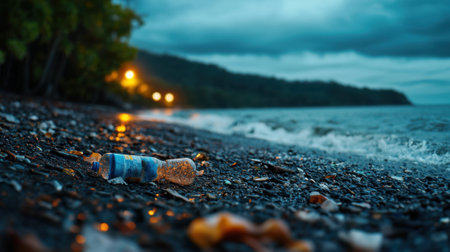 A bottle of water is laying on the beach next to some trash. The beach is littered with trash and the water is murky. Scene is one of sadness and disappointment at the state of the environment