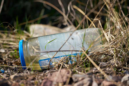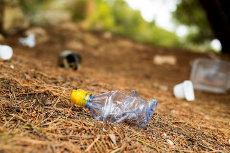 Bottles discarded in nature. Environmental pollution with plastic waste. Hazardous and toxic waste. Ecological disaster of the planet. Causes of climate change. Background with copy space for text