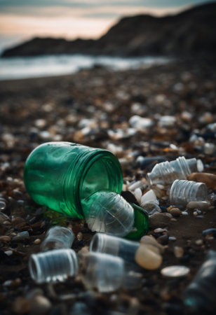 Green plastic bottle on the beach at sunset. Environmental pollution concept.