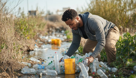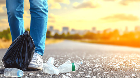 A dedicated individual engages in environmental cleanup, sorting through plastic waste and trash in an urban area, highlighting the need for sustainability.