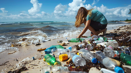 Woman collecting plastic waste on the beach. Pollution environment concept.