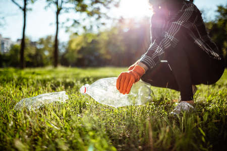 Woman collects used plastic bottle from the green grass lawn. A volunteer cleans up the park on a sunny bright day. Clearing, pollution, ecology and plastic concept