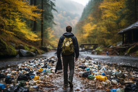 Male volunteer walks in the forest and collects garbage, plastic bottles and bags around, rear view