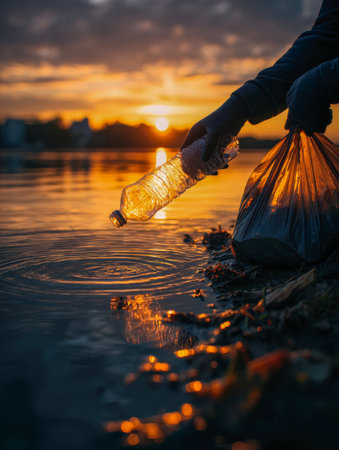 A dedicated individual in protective gloves gathers floating debris along serene lakebanks as the setting sun paints the sky in warm, golden hues, highlighting eco-c