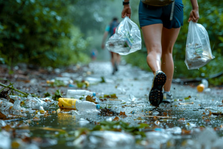 Witness the impactful scene of dedicated volunteers wearing gloves as they passionately collect plastic garbage outdoors. This powerful image embodies the essence of volunteering, ecology, and the collective effort to combat plastic pollution for the greater cause of environmental conservation.