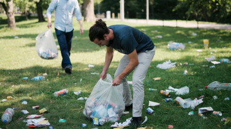 Caucasian males cleaning park of litter and waste on a sunny day.
