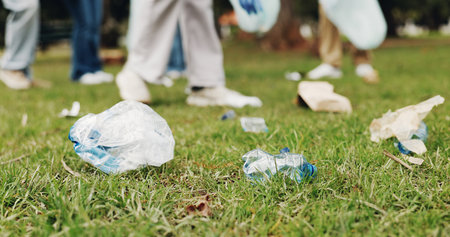 Cleaning, volunteer and people on grass with trash collection for sustainability, plastic and ngo project. Solidarity, garbage and hand with bag for charity, community care and social responsibility