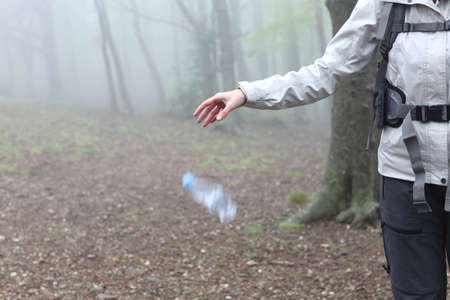 Close up of an uncivil trekker throwing garbage to the ground in nature