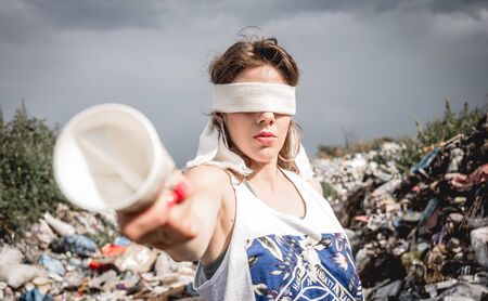 Person throws plastic bottle into bin at a dump full of garbage. Concept showing environmental pollution problem with scattered waste and recycling awareness.