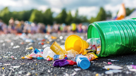 Trash spilling from a bin at a music festival, with mixed recyclables and non-recyclables underfoot