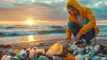 A person in a yellow jacket kneeling on the beach picking up trash, AI