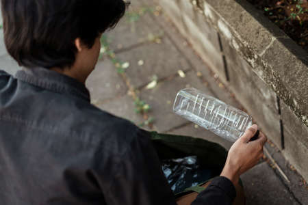 Man picks up litter outdoors, collecting used plastic bottle trash. A volunteer cleans up the park on a sunny bright day. Clearing, pollution, ecology and plastic concept