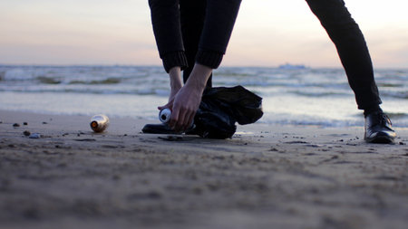 Close up of male volunteer collect and picking up garbage on the beach. Man cleans up coastline from plastic trash - bottles, cups. Volunteers cleaning the beach. Environmental pollution concept.