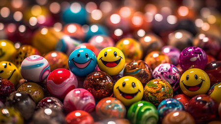 Closeup of a vibrant and colorful assortment of multicolored gumballs with a glossy texture, perfect for a delicious and chewy childhood treat or party snack