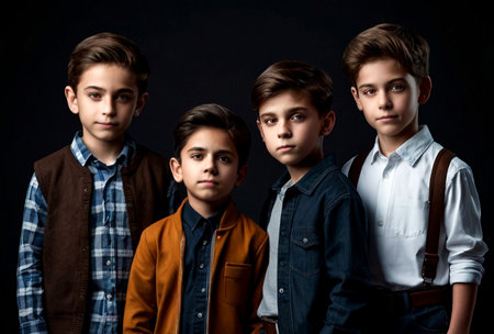 Four fashionable children school age boys posing at black isolated background, looking away. Group of friends schoolchild in stylish clothes different ethnicity kids. Childhood concept. Copy space