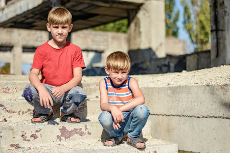 Two children are sitting on the steps of an abandoned building, a concept of the life of street children orphans.