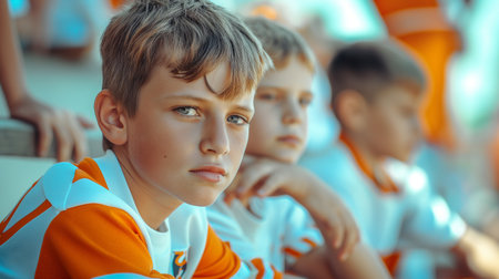 Children in vibrant sports uniforms warm up with smiles and stretches at sunny stadium before event