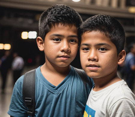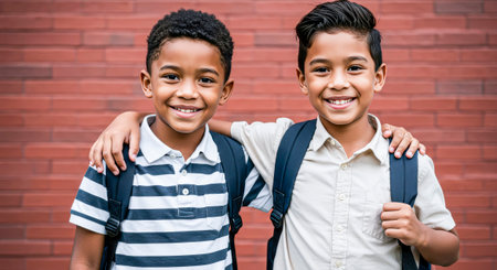 Together in a new city: Two children with backpacks laugh, a symbol of acceptance and assistance to displaced people.