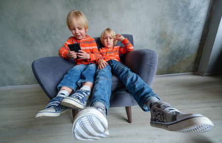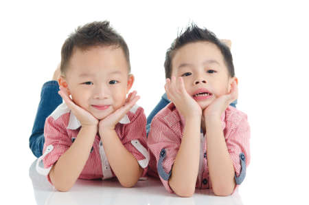 two happy little boys are sitting on the skateboard, dressed in red shirt with squares and jeans, isolated on white background, studio shot