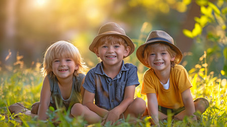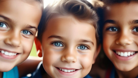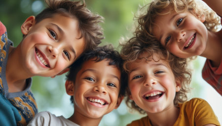 Four cheerful children, with bright smiles and sparkling eyes, gather closely, radiating pure joy against a lush green backdrop. Their diverse features and playful expressions capture the essence of childhood friendship, celebrating the magic of shared moments and carefree laughter.