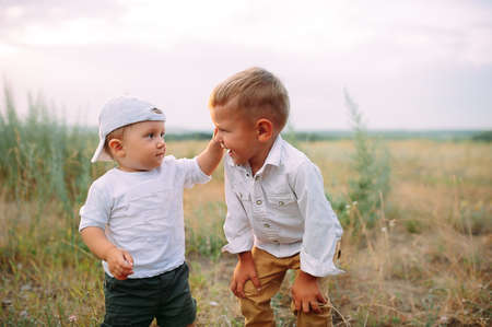 Little happy friends close-up. Two little boys of different nationalities are smiling. Children having fun against the backdrop of blurred nature outside in the warm season