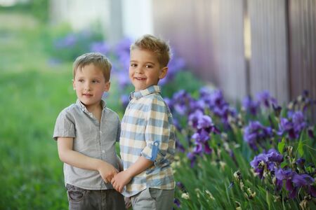 Happy little brothers kids in spring garden with blooming trees, outdoors.