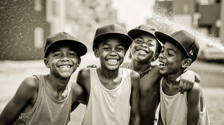 Four young boys wearing baseball caps and smiling with water droplets in the air around them