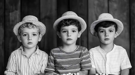 Three young boys, each wearing a straw hat, display serious expressions while sitting together. The background is likely wooden, adding warmth to this playful yet contemplative scene.