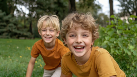 Two joyful young boys are playing together in a green park, showcasing their happiness and friendship. Their bright smiles reflect the essence of childhood joy.