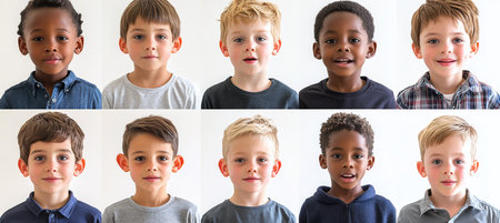 Faces of Childhood Ten Diverse Boys Expressing Emotion in Studio Portraits, Isolated on White