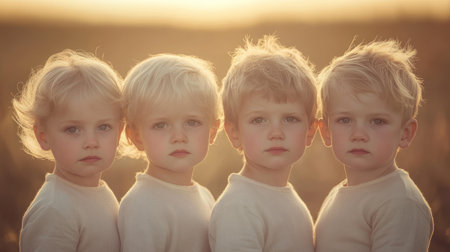 Four young children stand closely together, lost in thought as the sun sets behind them.