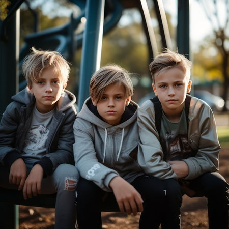 An AI generated illustration of three young boys, wearing backpacks, sit on a park bench with one of them looking off into the distance