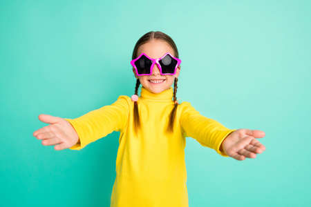 Portrait of happy smile brown haired little girl wear star glasses yellow turtleneck hug welcome you isolated on shine teal color background