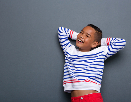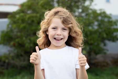 A portrait of happy kid boy with curly hair. Children and emotions koncept