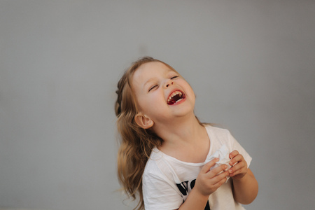 Beautiful little girl smile to camera. Gray background. we are all kids