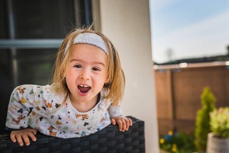 Little toddler girl laughing spontaneously while looking at you with showing her teeth
