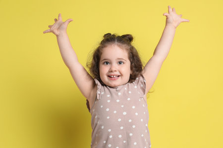 Portrait of happy smiling child girl gesture hands emotions grimace isolated background
