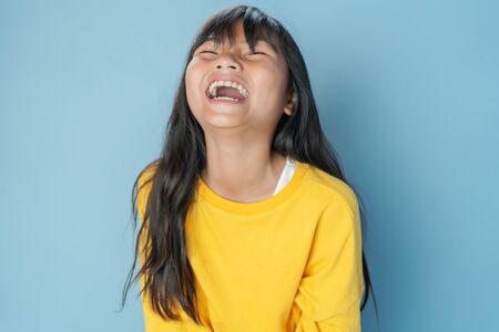 portrait of a happy little girl laughing on a blue background, happy childhood and lifestyle concept, copy space for text