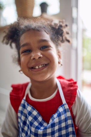Cute little young girl child standing in a kitchen waring a blue chekered apron and feeling joyful, smiling. Home, family lifestyle concept.