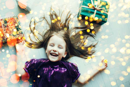 Little girl girl with a gift, cozy warm winter evening at home lies on the floor with gifts
