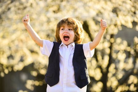 Happy childhood. Healthy child. Child care. Celebrate summer holidays. Boy nature background. Child development. Happiness. Excited kid. Adorable boy spring garden. International childrens day