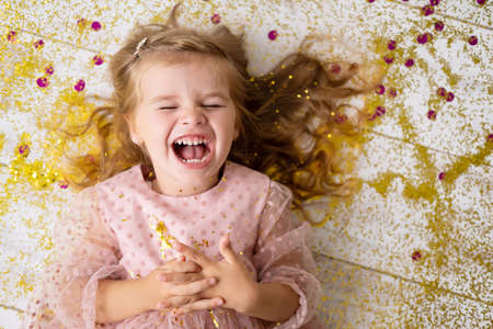 happy child girl in pink dress lying on floor with confetti and celebrating her birthday