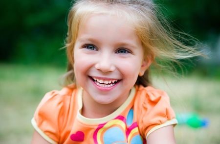 Portrait of happy smiling toddler girl outdoors. Little child with blond hairs looking and smiling at the camera. Happy healthy child enjoy outdoor activity and playing.