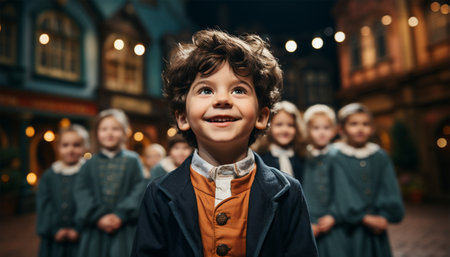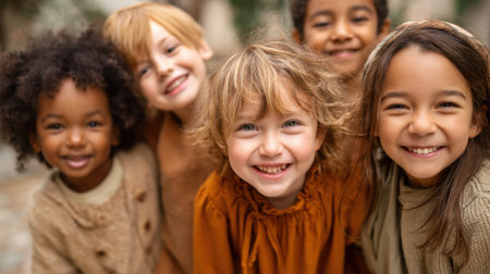 Diverse group of children smiling together outdoors, wearing warm sweaters and hats, creating a joyful atmosphere of friendship and playfulness in a charming environment