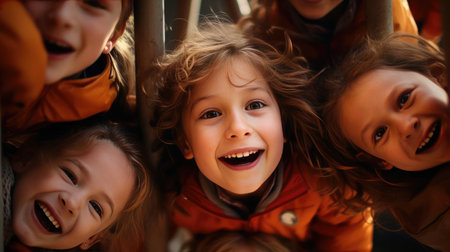 Joyful group of diverse children smiling and laughing outdoors on a bright sunny day, showcasing happiness, friendship, and fun.