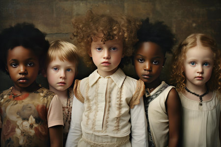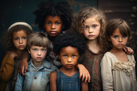 A diverse group of children, of various ages and backgrounds, standing side by side, Sad serious Multiethnic poor little children looking at the camera, AI Generated